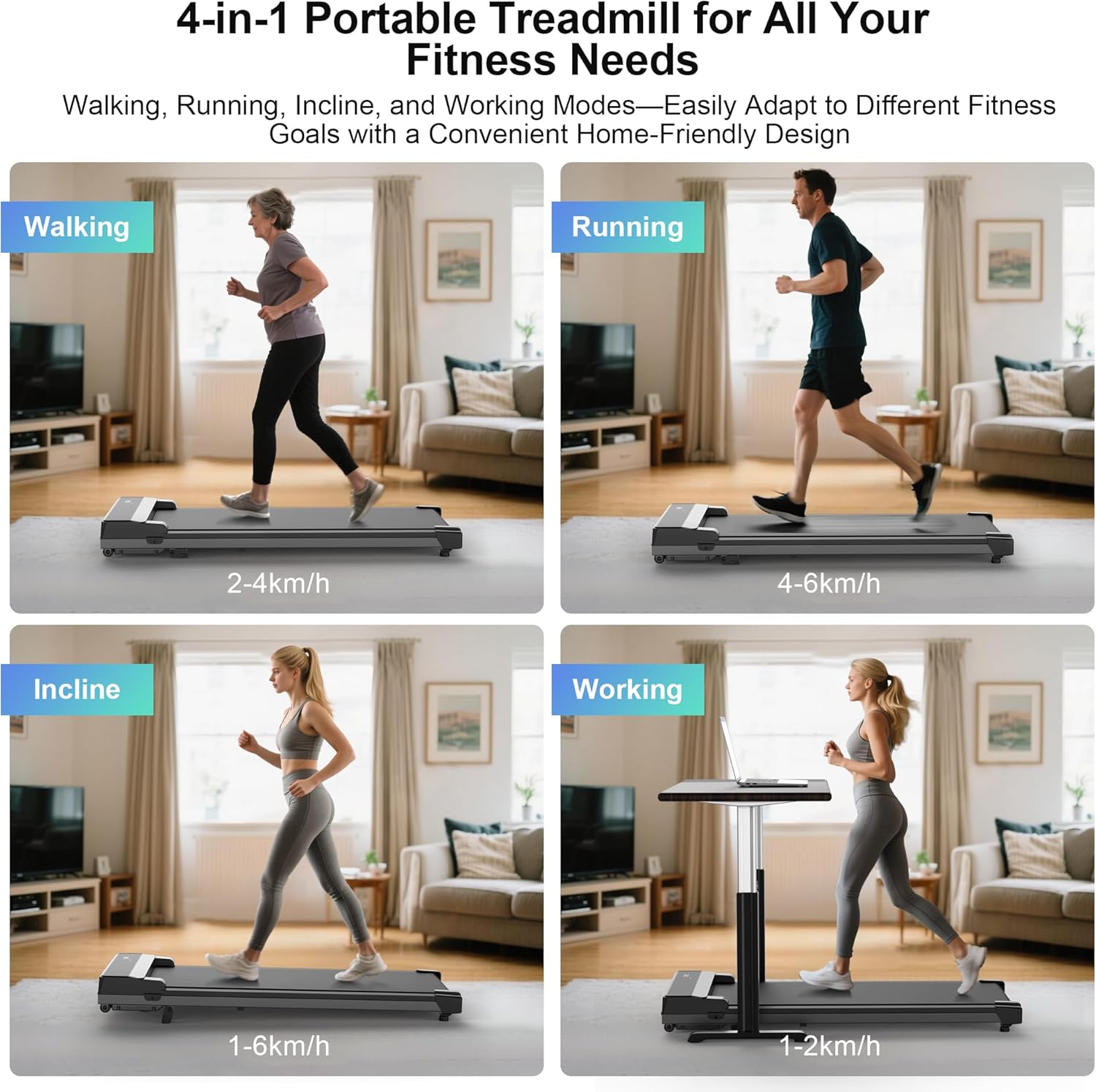 Powered by a high-performance motor with speeds of 1-6 KM/H, this desk treadmill is suitable for office walks to brisk walking. Built with a high-strength steel frame for stability and quiet performance, it's ideal for home or office use and doubles as an under-desk solution for light exercise while working.